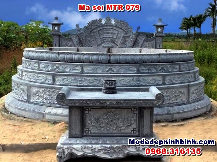 Mẫu mộ đá tròn Ninh Bình MTR 079 có kích thước lớn đường kính trên 4m, mộ có 5 cấp được chia cân đối với nhau, phía trên cùng là biểu tượng nụ sen trong đạo phật như thế toàn thể ngôi mộ đá tượng trưng cho một bông sen có ý nghĩa yên bình thanh tịnh. Như chúng ta đã biết ý nghĩa của mộ đá hình tròn về phong thủy là đem lại nhiều sinh khí tốt cho ngôi mộ. Đằng sau mộ là bức hậu thể hiện dưới dạng cuốn thư rồng chầu mặt nguyệt phía trên. Phía trước mộ gia chủ có bày một bàn lễ đá để có thêm diện tích sử dụng.