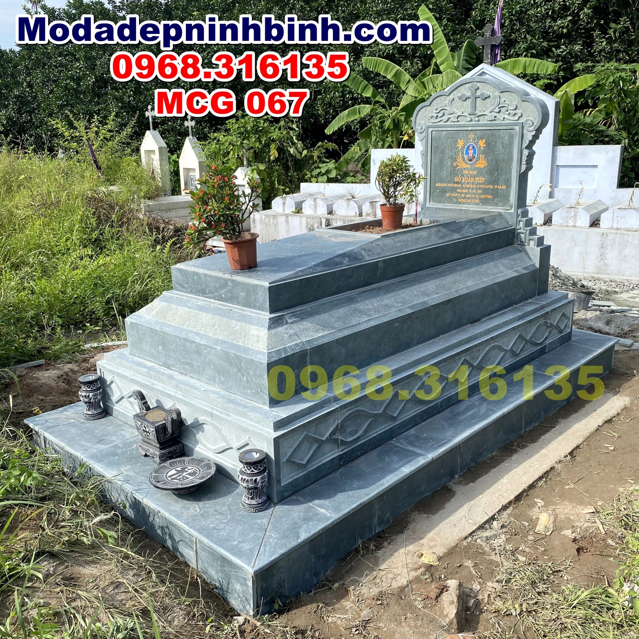 Lắp đặt mộ đá công giáo cho gia đình anh Ca tại huyện Thường Tín, Hà Nội. Mẫu mộ đá thực chất gồm 3 cấp với phần đế móng bê tông đã được cơ sở chúng tôi ốp bằng đá mỏng 2cm nên nhìn qua ảnh nhiều người tưởng nhầm thành 4 cấp. Nếu không tính lớp bê tông được ốp lát đá thì phần cấp tiếp xúc bê tông có kích thước 127x255cm với chiều cao tới cấp 3 mặt mộ là 83cm – và từ cấp 1 lên hết bia đá cao là 163cm. Chất liệu đá xanh rêu được sử dụng tạo độ bền đẹp trước thời tiết nhiệt đới như Việt Nam.