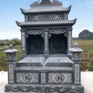 Sự kết hợp mộ đá đôi với lăng thờ chung được thiết kế độc đáo hơn những mẫu thông thường. Phần giữa là lăng thờ chung và 2 mộ ở 2 bên. Mộ có 3 mái 3 đao chạm khắc kiểu mái ống cổ điển đẹp mắt, được xây dựng chuẩn theo phong thủy, mang đến sự uy nghi cho công trình tâm linh.
